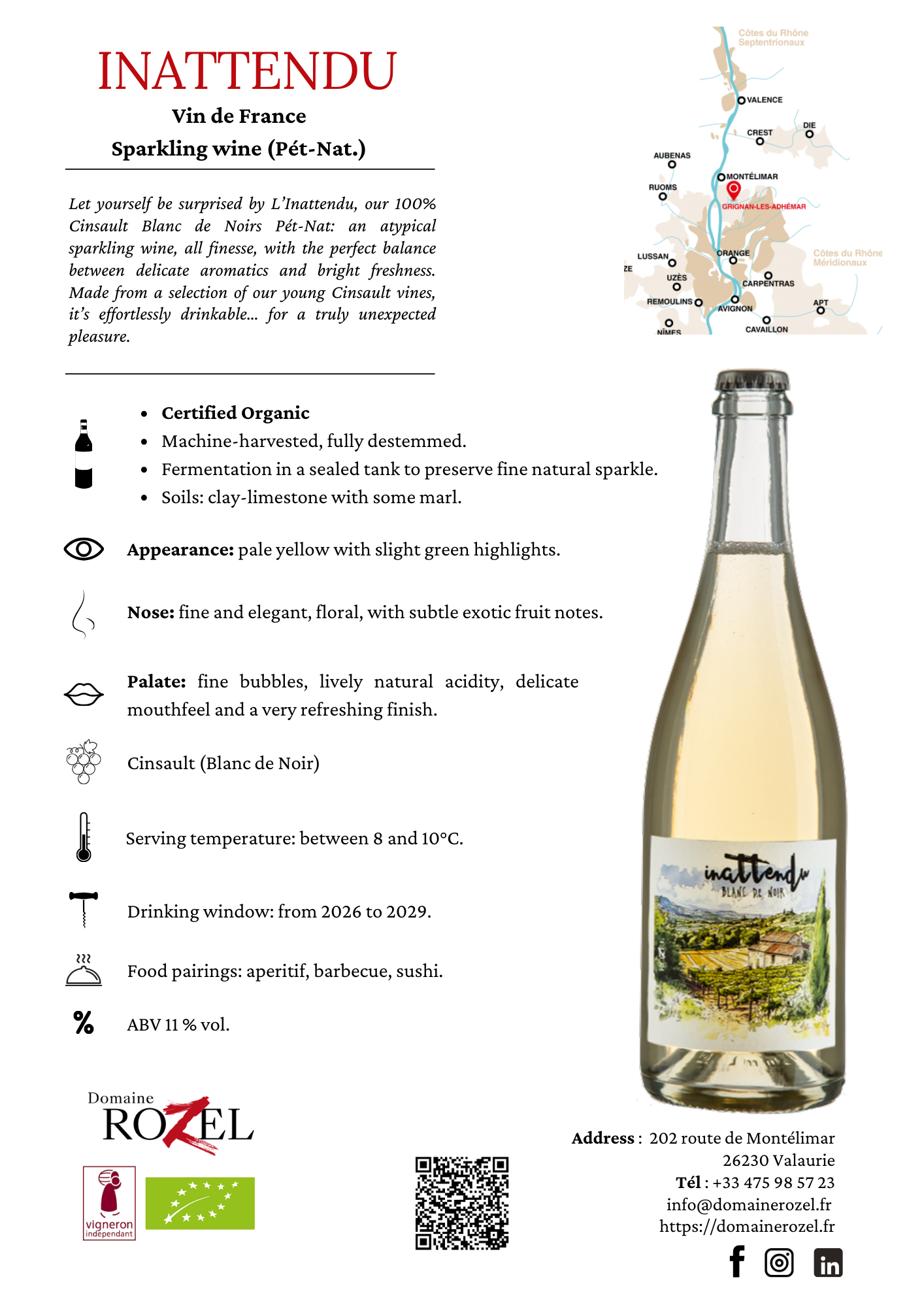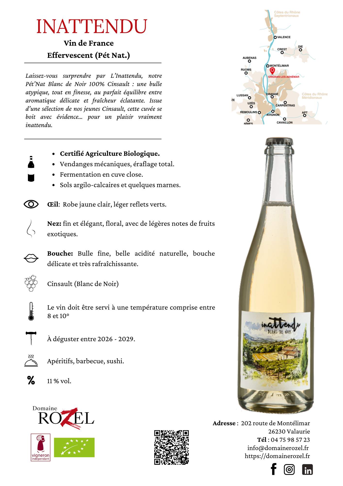 Inattendu incarne l’esprit de découverte et de liberté. C’est un vin festif, idéal pour l’apéritif, les soirées d’été ou les moments conviviaux à partager entre amis ou en famille.