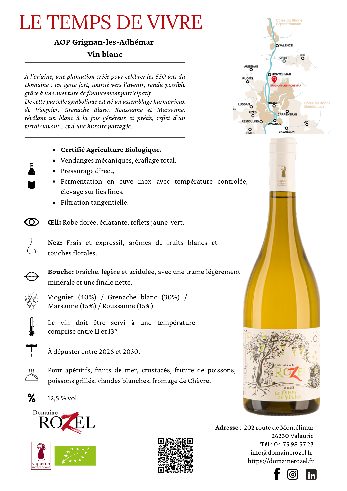 La cuvée « Temps de vivre » invite à savourer chaque instant et à prendre le temps d’apprécier les plaisirs simples de la vie. C’est un vin convivial qui se prête à la détente et aux moments partagés entre amis ou en famille.